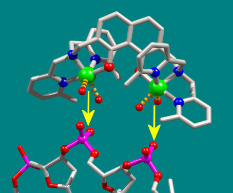 The copper ions sit at two points protruding from the molecule - like a horseshoe presenting its two ends (see the figure). The distance between the two points of the "horseshoe" is exactly the same as the distance between the phosphates in the DNA, so the molecule docks snugly onto the DNA. "Because two phosphates bind simultaneously, the binding strength is greater and that increases the efficacy," says Prof. Glaser.
