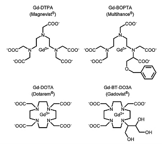 Figure 1: Structures of the frequently applied gadolinium-based contrast agents for MRI examinations with respective trademarks