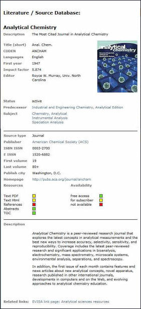 EVISA's unique journal Database is giving access to about 3800 scientific journals from many different publishers. Journals included are potentially of interest for all scientists working on topics related to trace elements and their speciation. EVISA is listing not only the major journals with great impact but also those providing information for special regions (Africa, Asia, South America).